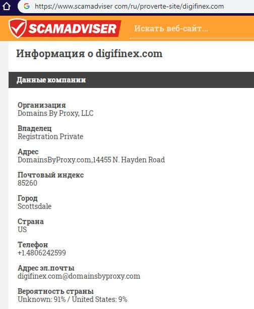В связи с мошеннической и противозаконной деятельностью лохотрона DigiFinex его реальные руководители предпочитают анонимность дабы избежать ответственности со стороны правоохранительных органов. Техническую же информацию о сайте жулья Диги Файнекс можно узнать непосредственно с помощью портала scamadviser com, что вы можете увидеть ниже.