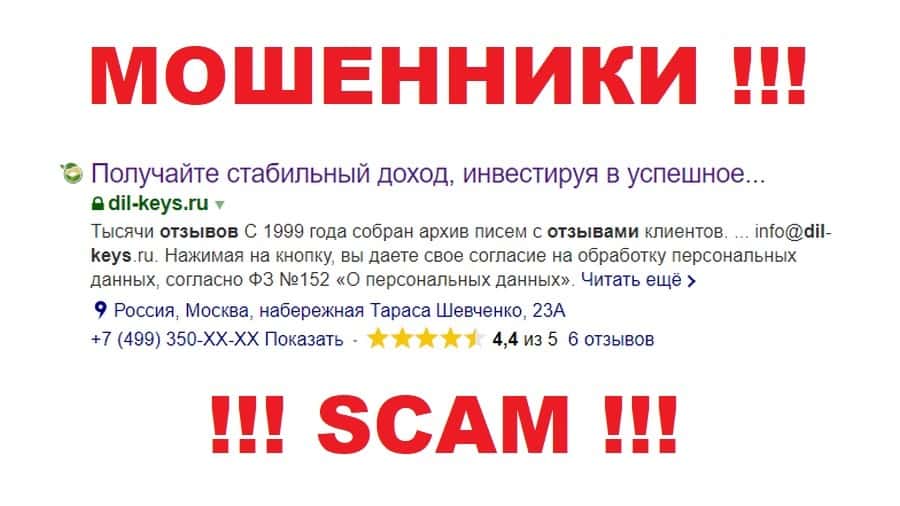 На сайте мошеннической конторы Dil-Keys Ru указан московский номер телефона, с которого жулики звонят своим потенциальным клиентам, будьте осторожны!