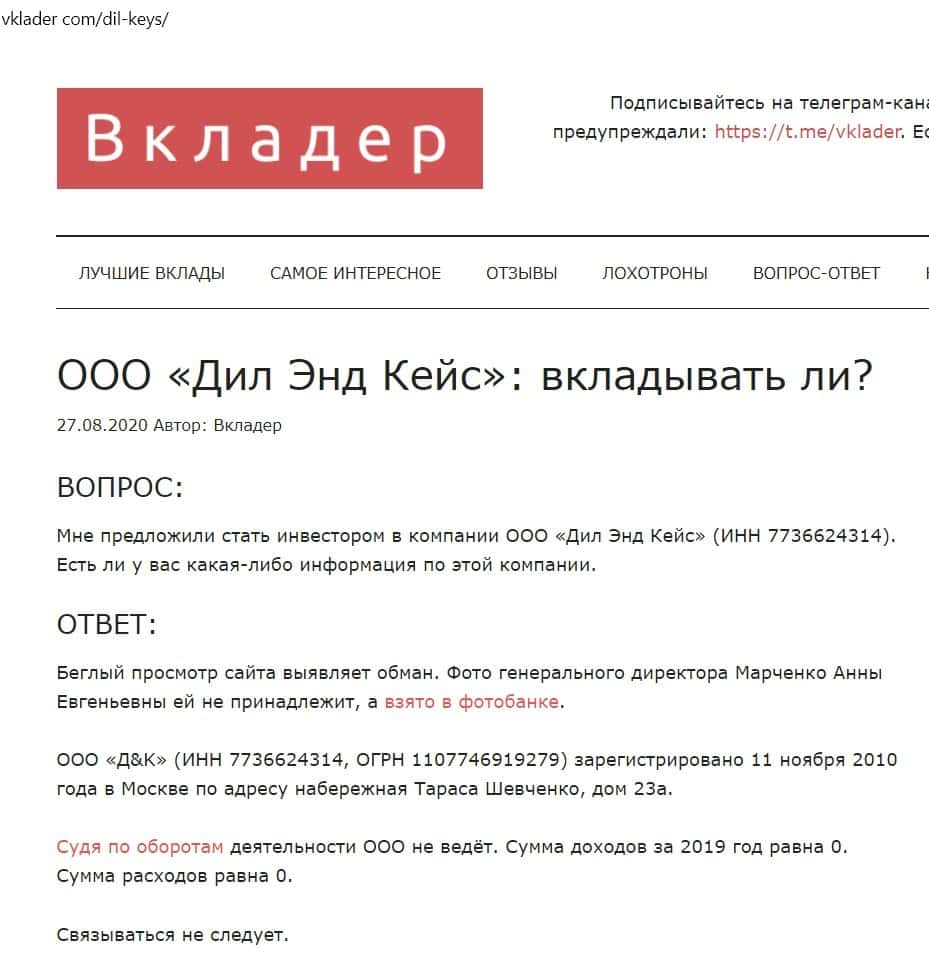 Дил Энд Кейс - фальшивая финансовая компания, очередной развод на рынке инвестиций. Контора якобы инвестирует в производство биологически активных добавок и занимается сбором средств на развитие отрасли фармацевтики. Но реалии таковы, что это просто еще один лохотрон, созданный для того, чтобы доверчивые вкладчики несли свои деньги прямо в карманы создателей скама. О том, что проект лживый говорит тот факт, что их деятельность ничем не подтверждена, никаких наград не существует, слова о патентах взяты с потолка. Никаких доказательств инвестирования нет, то есть средства клиентов перетекают на счета владельцев лжеинвестора. Dil-Keys Ru - обманщики и разводилы, обходите их как можно дальше!