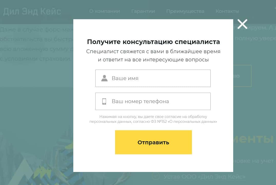 Клиенты компании Дил Энд Кейс имеют возможность заказать обратный звонок, для этого нужно заполнить специальную форму и указать свои личные данные.