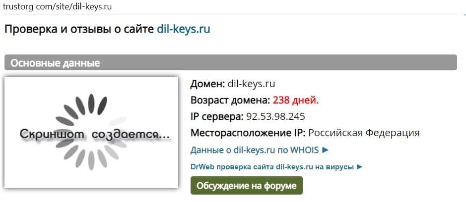Возраст доменного имени сайта Dil-Keys Ru составляет 238 дней. Контора достаточно новая, поэтому доверять ей не имеет никакого смысла, плюс другие признаки шулерства.