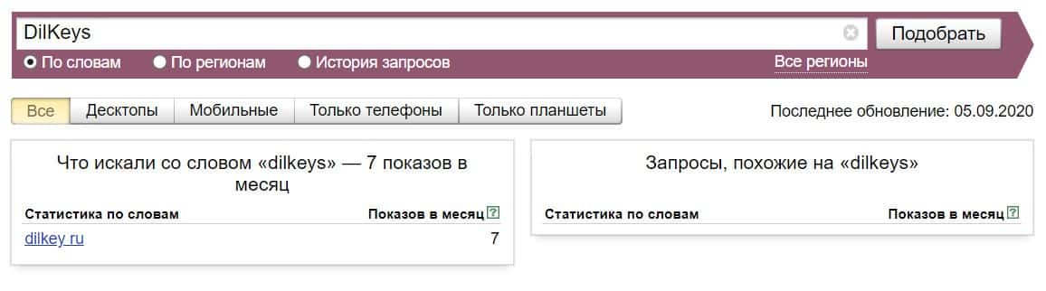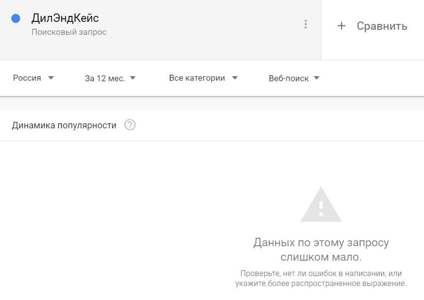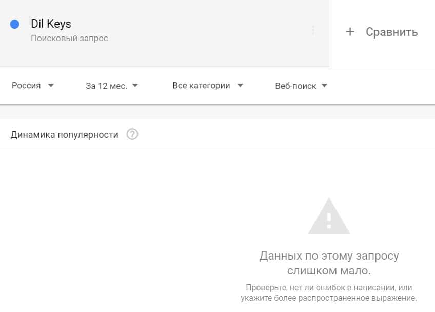 Посмотрим, насколько популярно название бренда "DilKeys", написанное на английском языке. Данных по этому запросу нет, так как никто не искал этот бренд в Гугл.