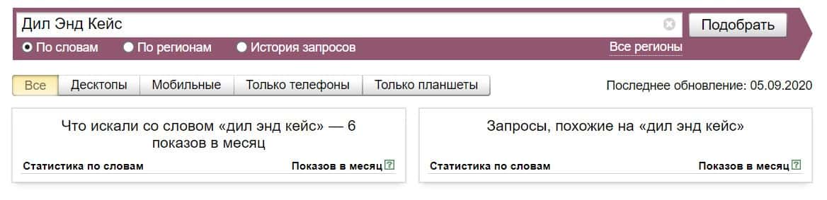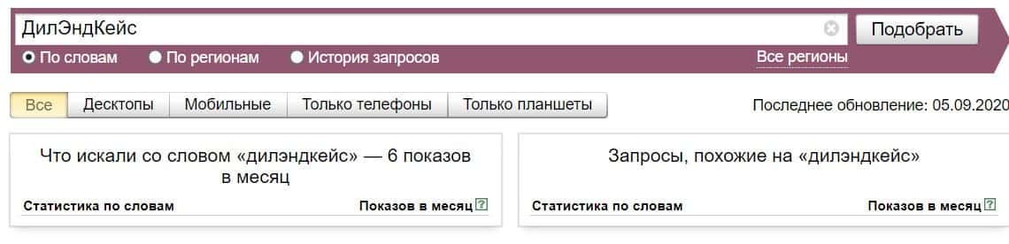 Посмотрим, сколько раз люди искали название бренда "Дил Энд Кейс" на русском языке с пробелом: результат 6 показов.