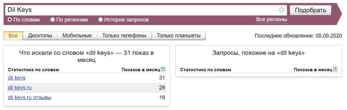 То же название "Dil Keys", но написанное с пробелом, пользователи пытались найти в системе Яндекс всего лишь 31 раз.