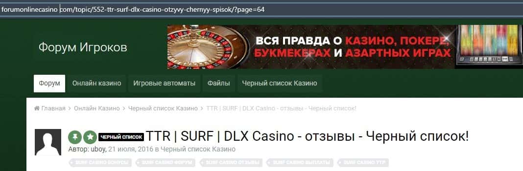 Ниже представлена информация о мошеннической конторе DLX Casino, где ее приписали к ряду мошеннических казино. А именно сюда вошли уже известные TTR Casino и SurfCasino.