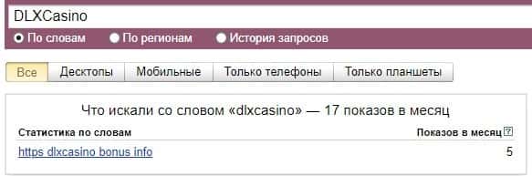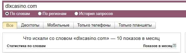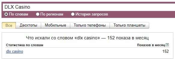 Запрашиваемый бренд "DLXCasino" в статистике Яндекс Вордстат занял около 17 показов за месяц, поэтому они не очень распространенные в сети интернет.