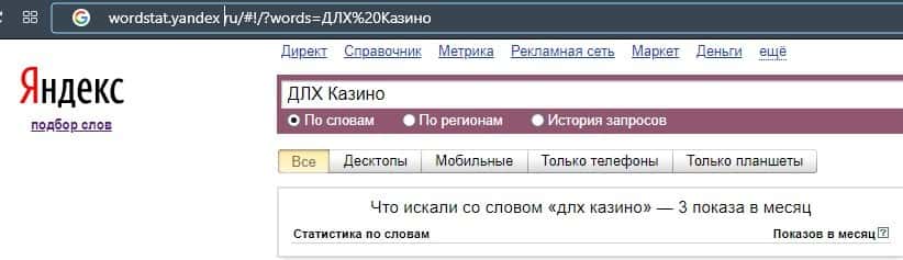 Запрос бренда "ДЛХ Казино" в базе Яндекс.Вордстат набрал 3 показа за месяц, поэтому он не составляет угрозу пользователям сети.