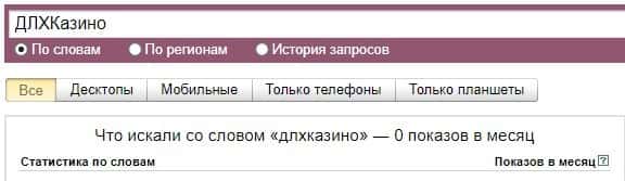 Бренд "ДЛХКазино" не популярен среди русскоязычного населения. Как раз из-за этого и количество запросов в размере 0 показов за последний месяц.