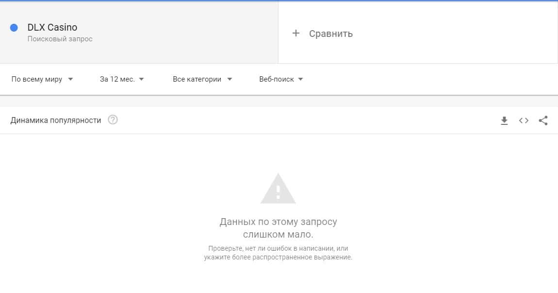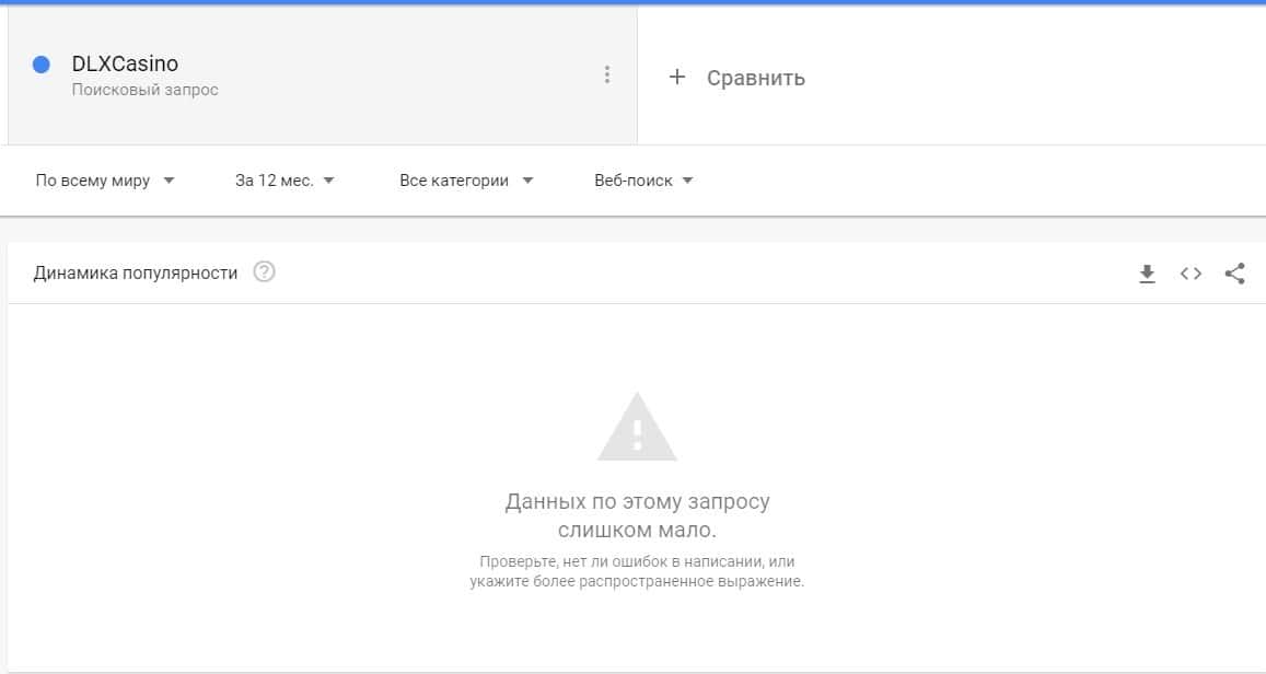 Бренд "ДЛХ Казино" по запросам не набрал достаточное количество запросов в Гугл, поэтому и Гугл Трендс не выдал никакой статистики.
