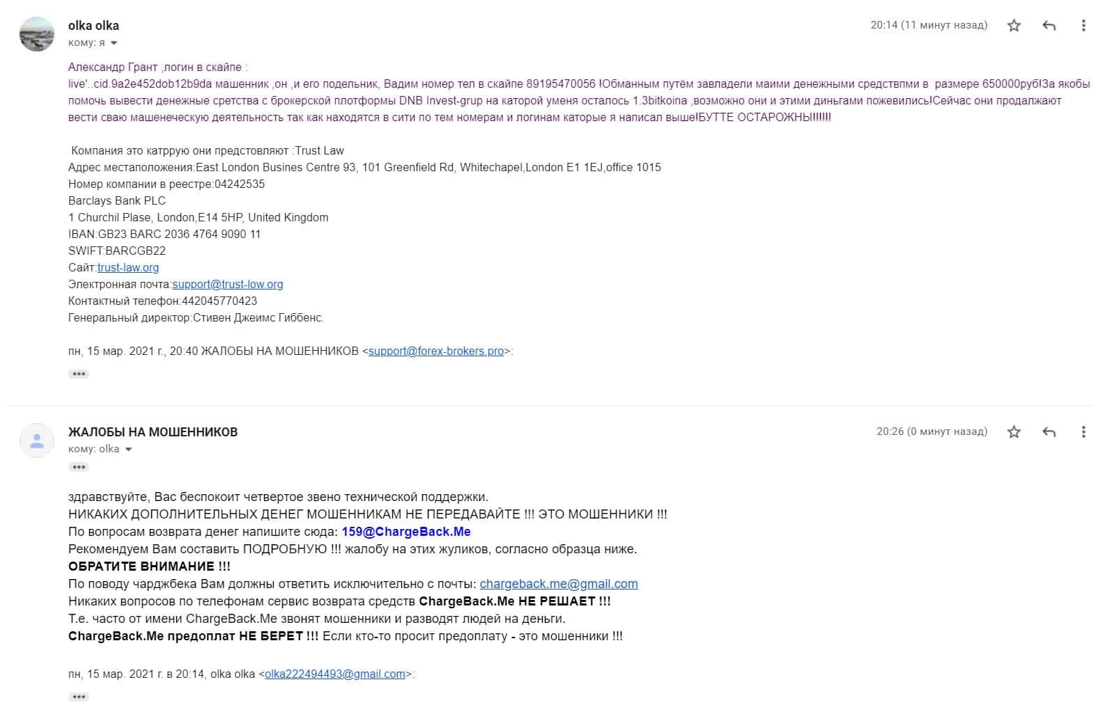 Далее предлагаем ознакомиться с жалобой от пострадавшего о том, что аферисты ДНБ Инвест Групп действуют сообща с мошеннической организацией Траст Лав.