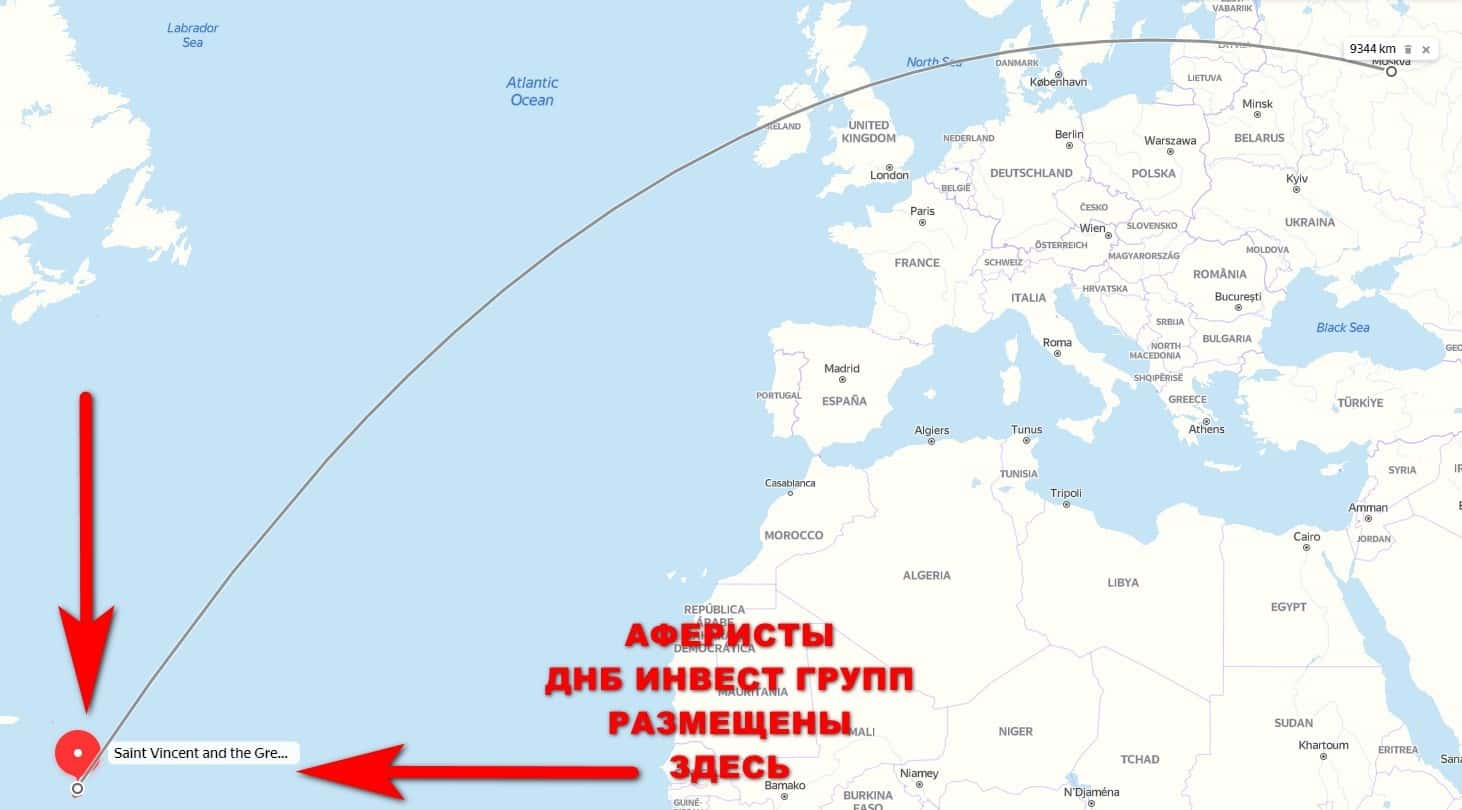 Ниже вы можете ознакомиться с местоположением конторы DNB Invest Group. Как оказалось, лохотрон расположен в оффшорной зоне островов Сент-Винсент и Гренадины.