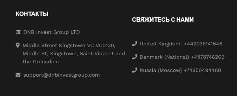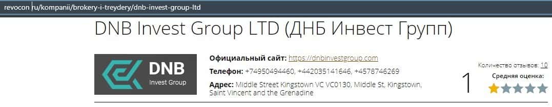 ДНБ Инвест Групп - очередной мошеннический брокер оффшорного происхождения (регистрация на островах Сент-Винсент и Гренадины), который предоставляет кухонный доступ к валютному рынку Форекс, обворовывая при этом своих клиентов. Аферисты не имеют лицензии, выставляют фейковое руководство, а также используют свой договор, дабы ввести трейдеров в заблуждение. Поэтому мы настоятельно не рекомендуем связываться с форекс-аферой DNB Invest Group.