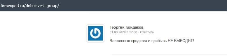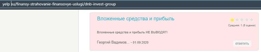 Лохотрон DNB Invest Group не выводит вложенные средства и это подтверждает еще один пользователь сети. Люди уже прочувствовали на себе все прелести работы с аферой.