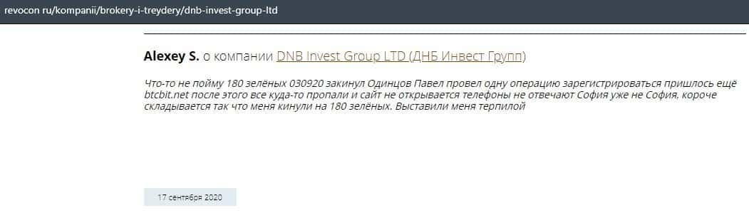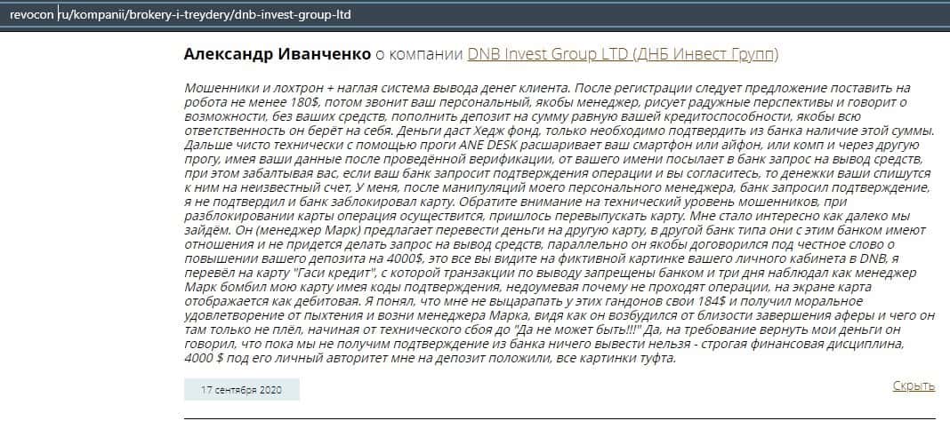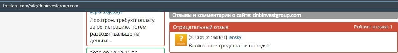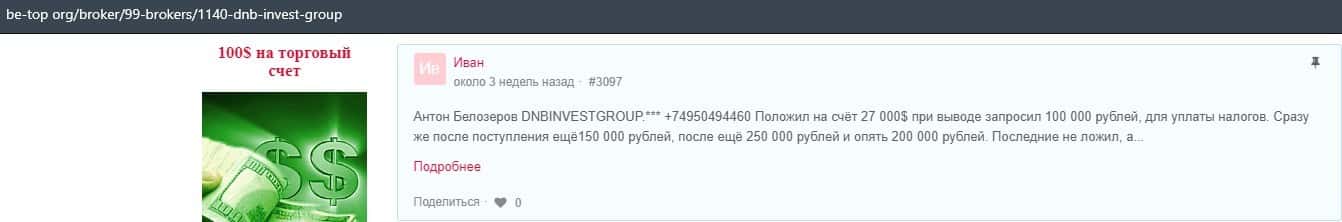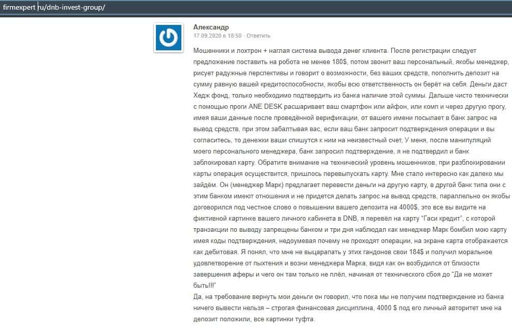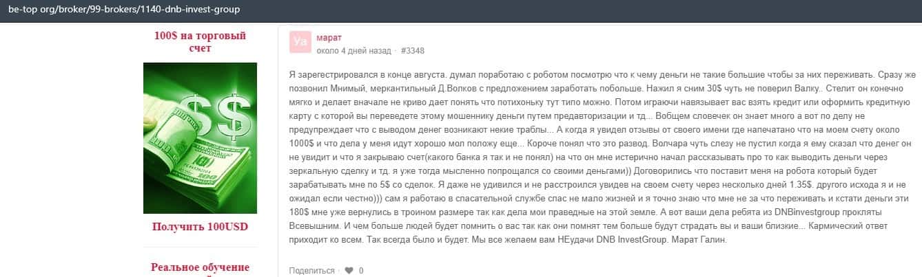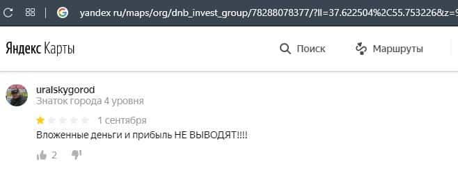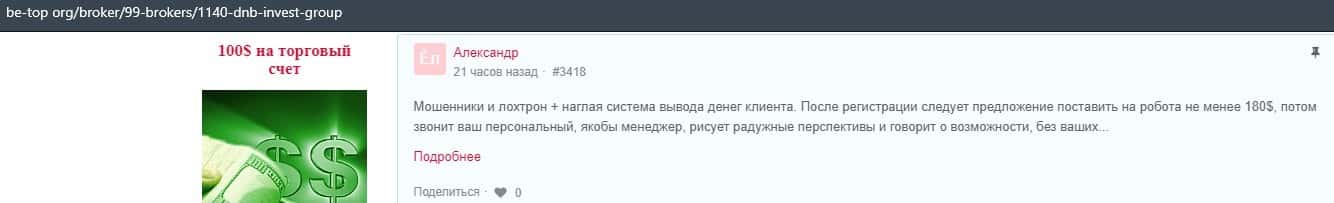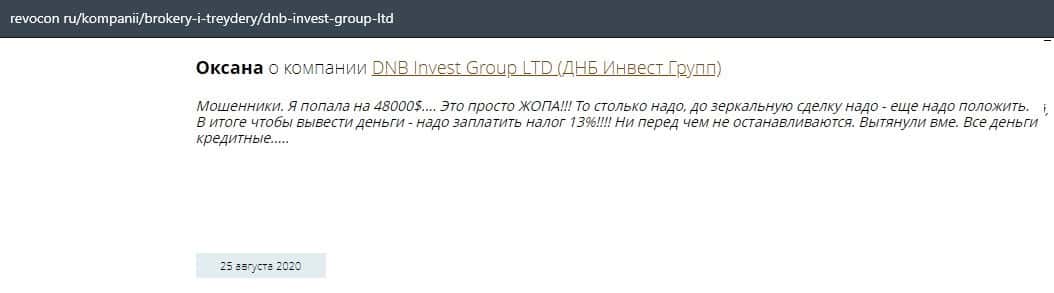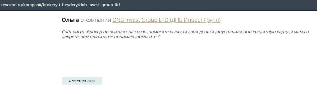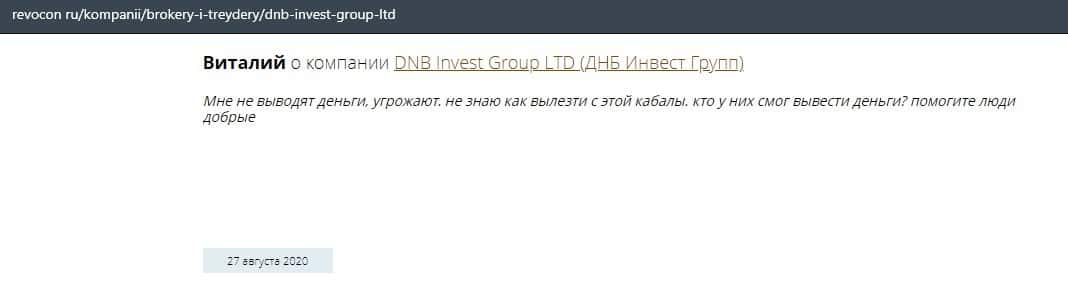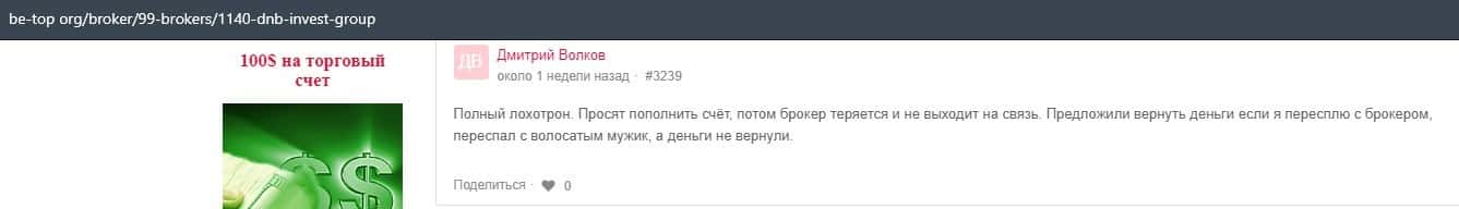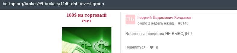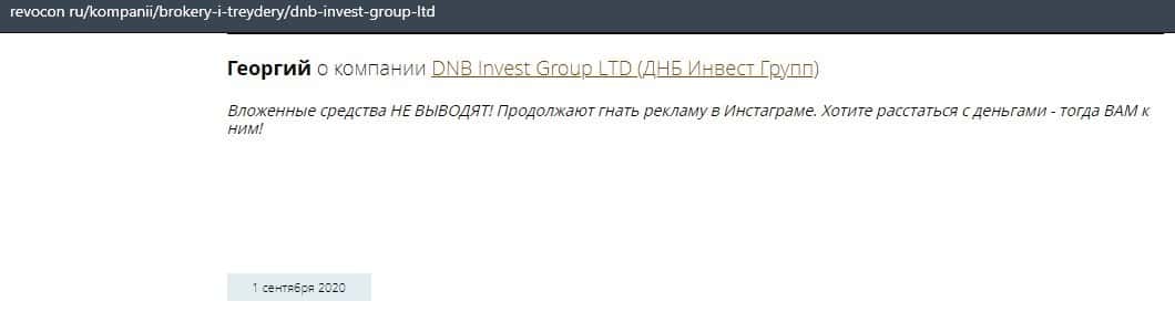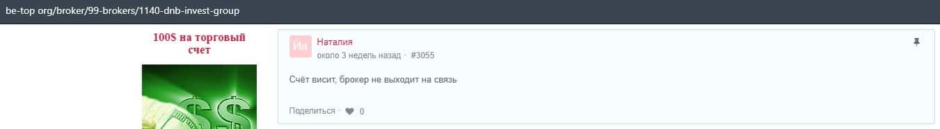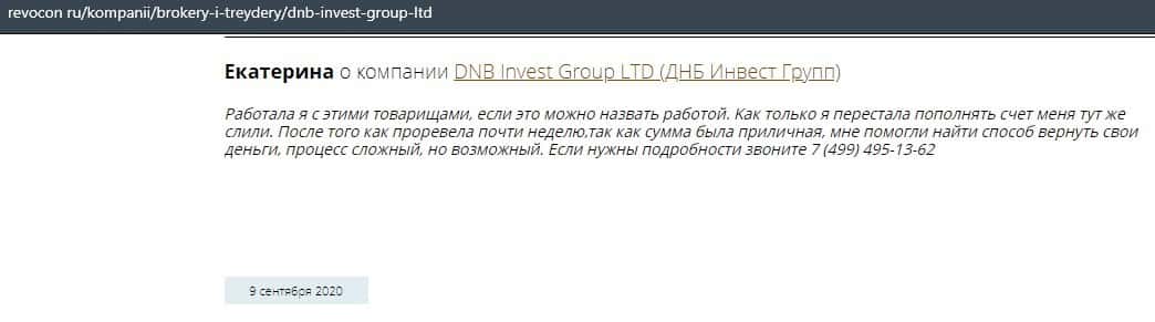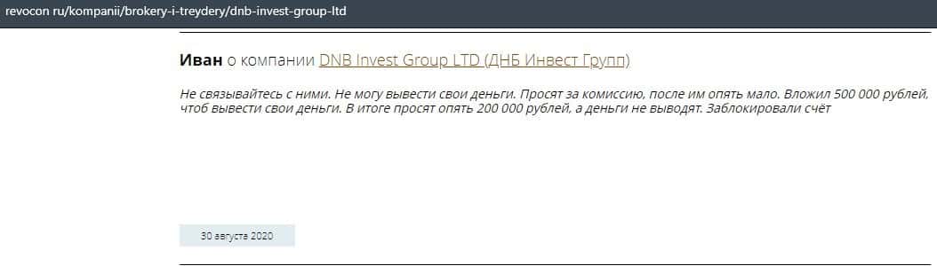 Следующим отзывом автор указывает, что контора DNB Invest Group не вывела со счета клиента ни копейки. И это уже не первый случай такого поведения аферистов.