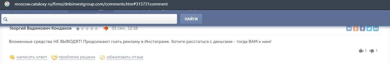 Человек заверяет в своем отзыве, что контора ДНБ Инвест Групп не выводит деньги, хотя в тоже время продолжают проводить рекламную кампанию в Инстаграме.