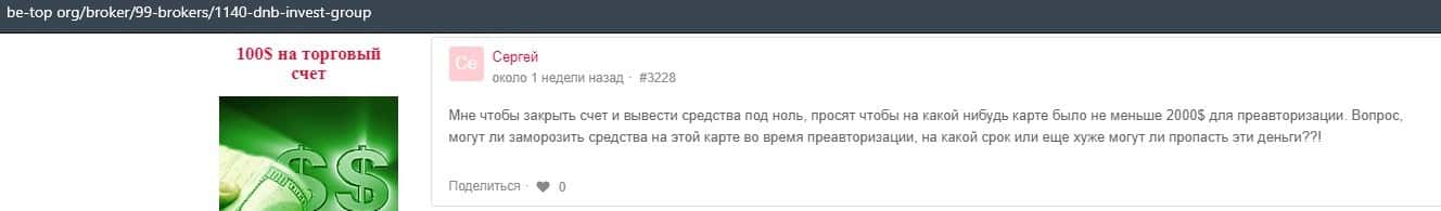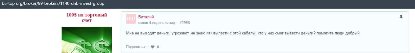Еще один пользователь сети указал, что контора DNB Invest Group наглым способом не выводит деньги клиентам. Стоит обходить стороной таких форекс-ворюг.