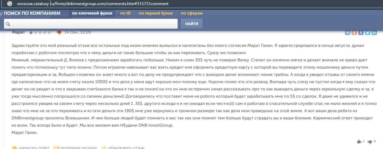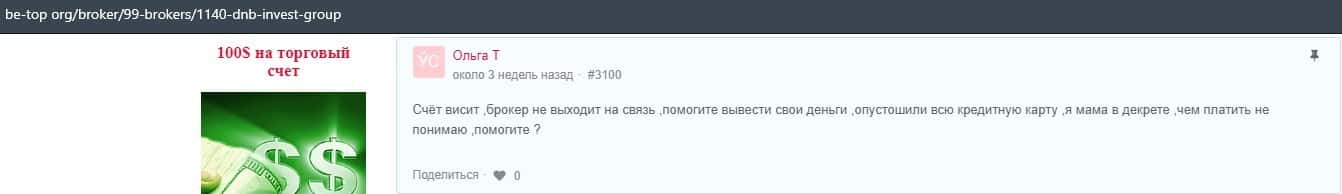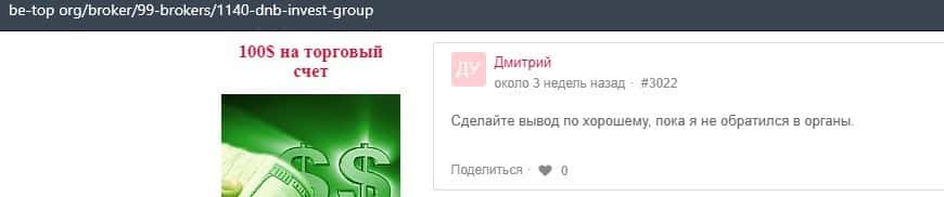 В данном разделе предлагаем увидеть информационный материал в виде жалобы на обманщиков ДНБ Инвест Групп, которые не вывели денежные средства клиенту.