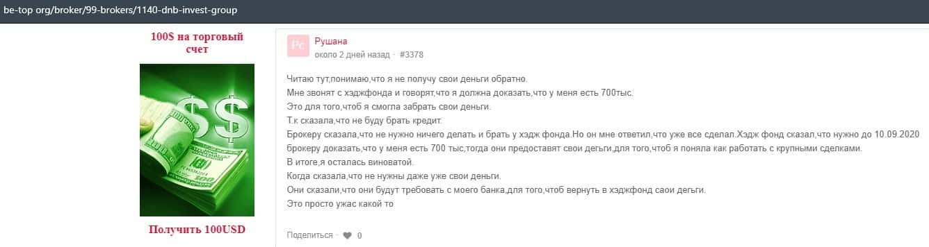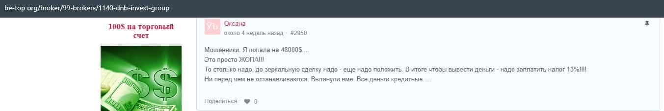 Жалоба на разводил ДНБ Инвест, которые кинули клиента на 1400 долларов