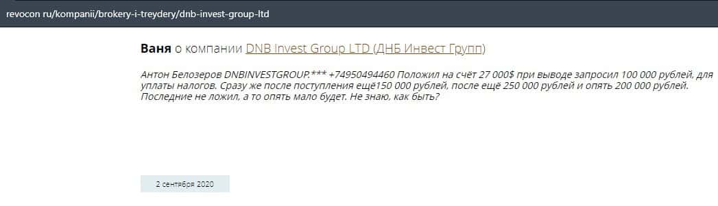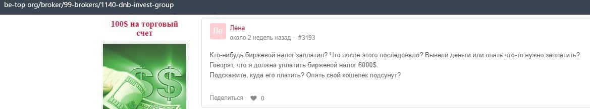 Автор отзыва рассказал, как он вложил в контору DNB Invest Group 27000 долларов, а теперь менеджеры говорят, чтобы их вывести нужно заплатить налог 100 000 рублей.