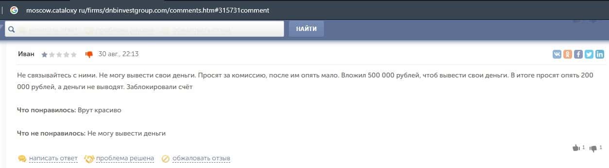 Инвестор рассказал в своем отзыве, что контора ДНБ Инвест Групп заблокировала ему счет. Сначала он вложил туда 500 000 рублей, а потом стали просить еще 200 000 рублей.