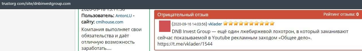 В этом отзыве пользователь сети акцентирует внимание на ресурс, где появилось разоблачительное видео касательно лохотрона DNB Invest Group и вся правда о нем.