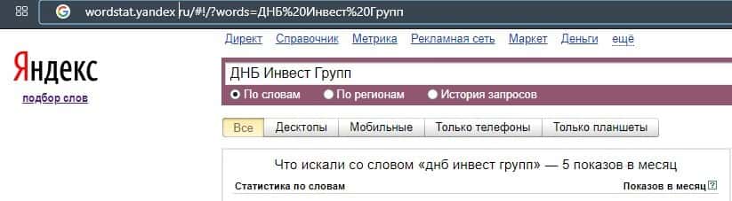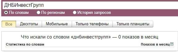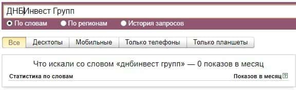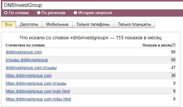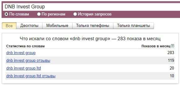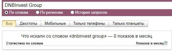 Не так уж и популярней контора стала по бренду "DNBInvest Group", так как Яндекс Вордстат отметил всего-то 0 показов за последний месяц.