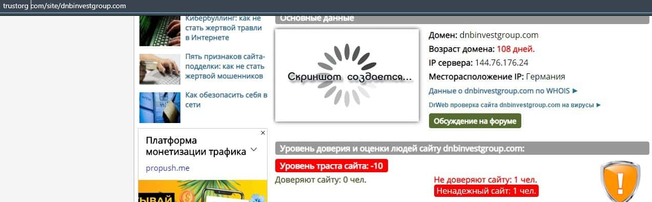 Шарлатанская организация ДНБ Инвест Групп работает больше 108 дней, вернее работает ее сайт. Это подтверждает, что данный брокер это кухня-однодневка.