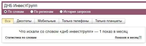 Что касается бренда "ДНБ ИнвестГрупп", так здесь поисковая система Яндекс обнаружила только один показ за последний месяц, что показывает их не популярность.