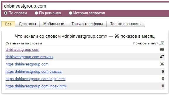 Что касается запроса "dnbinvestgroup.com" так здесь такая же ситуация. Всего 99 запросов в месяц выдала поисковая система Яндекс.