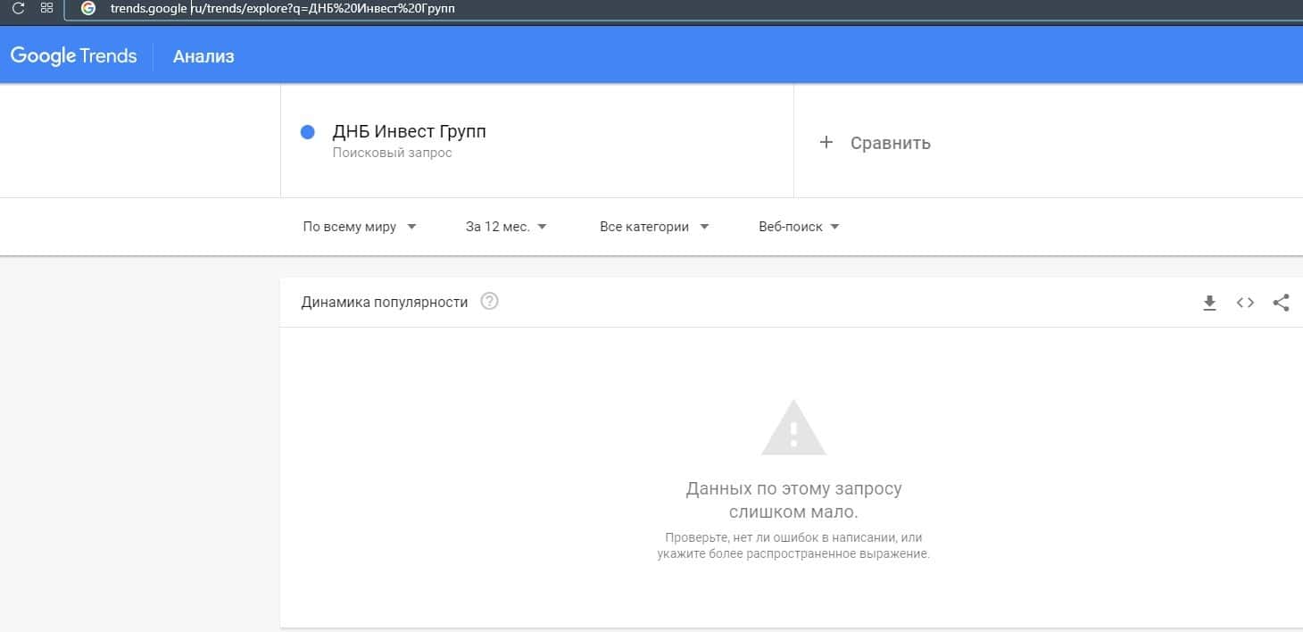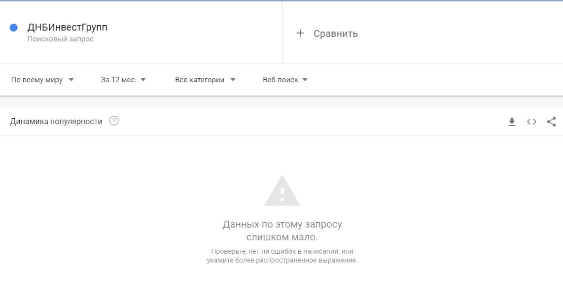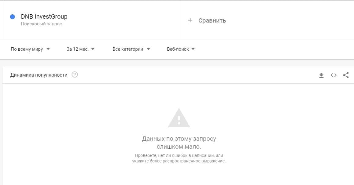 Тоже самое можно сказать и о бренде "ДНБ ИнвестГрупп". Система Гугл Трендс имеет слишком мало данных по запросам, чтобы свести статистику.