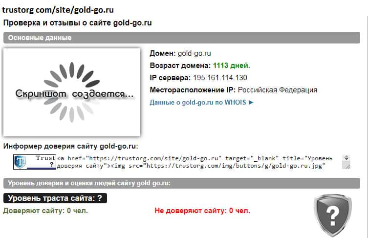 Перед тем как кому-то доверять свои средства либо инвестировать их в какой-то проект, следует провести проверку. На авторитетных ресурсах есть необходимая информация, которая сразу выявляет жуликов. Контора Gold-Go Ru более трех лет зарегистрирована на инвестиционном рынке, а уровень доверия пользователей равен нулю.
