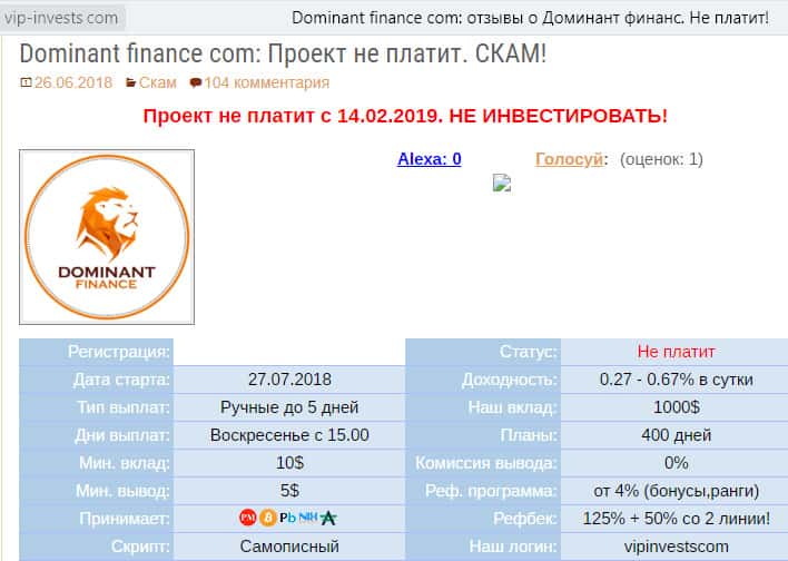 Доминант Финанс – соскамившаяся мошенническая организация. Данные мошенники орудовали на рынке криптовалют. Они предлагали доход людям, инвестирующим в их якобы потенциально успешный проект. На деле Dominant Finance оказалась очередной шарашкой, взявшей деньги у людей прекратившей выплаты!