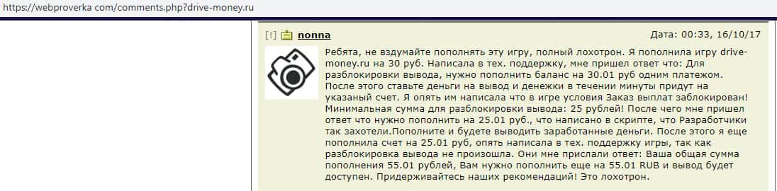 На изображении, расположенном ниже, вы можете наглядно увидеть очередной негативный комментарий в строну аферистов Драйв Мани, которые попросту не выводят деньги наивному пользователю сети интернет, который решил начать играть на их мошенническом сайте, в результате чего вполне ожидаемо был кинут мошенниками Drive-Money Pro.