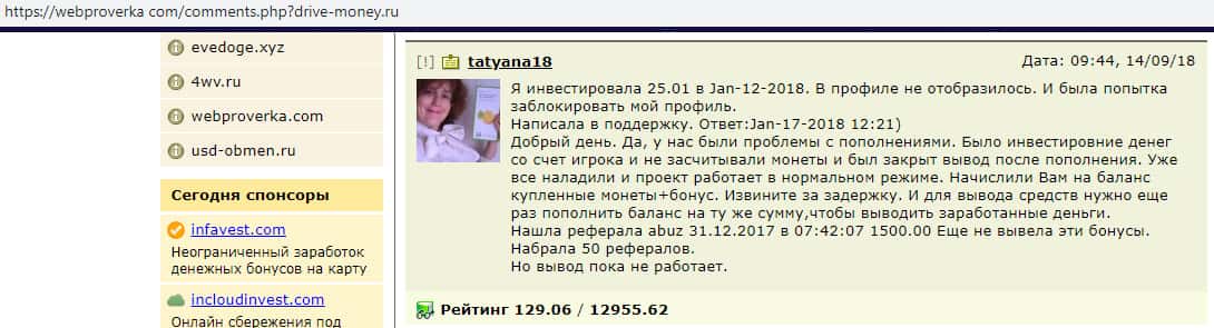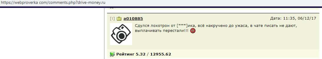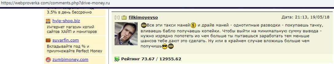 - Пользователь сети интернет не рекомендует иметь дело с жульем Драйв Мани на веб-сайте вебпроверка ком
