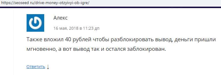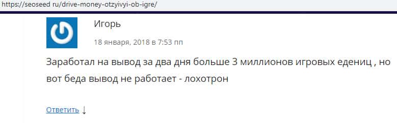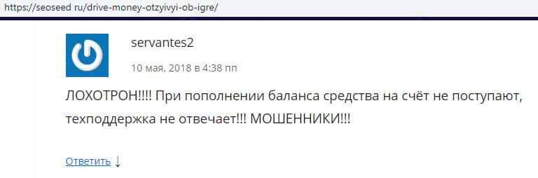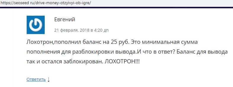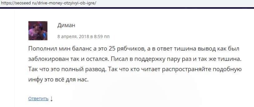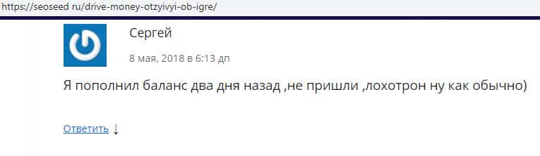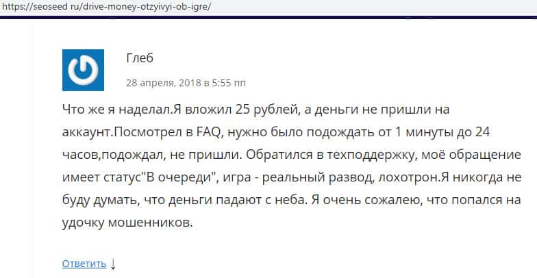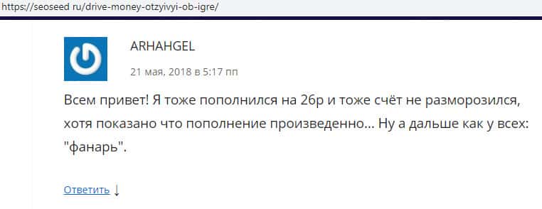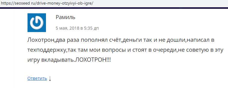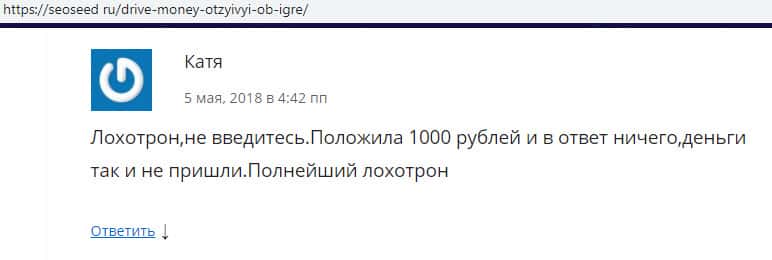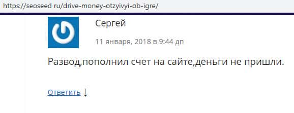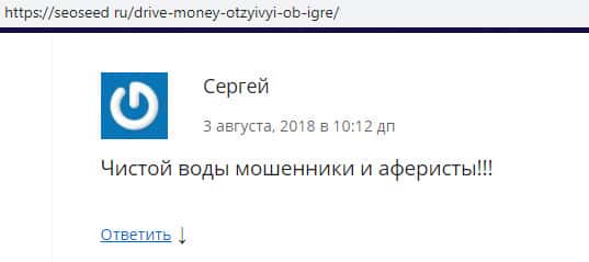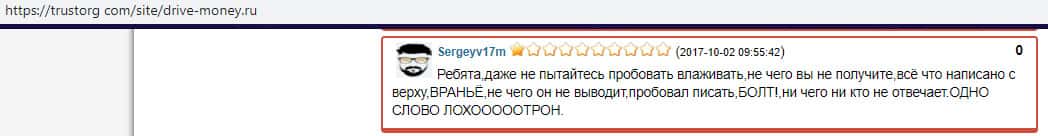 На изображении, расположенном ниже, вы можете наглядно увидеть негативный отзыв о лохотроне Drive-Money Pro с веб-сайта сеосеед ру, в котором очередной наивный пользователь сети интернет не рекомендует иметь дело с жуликами Драйв Мани так как они попросту развели его на ввод средств в свою помойку, после чего не выводят деньги обратно.