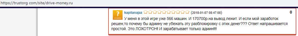 На изображении, расположенном ниже, вы можете увидеть и прочесть еще один негативный отзыв в сторону аферистов Drive-Money Pro, который связан с тем, что шулера Драйв Мани попросту блокируют вывод средств наивным пользователям сети интернет, а так же ограничивают их действия на своем весьма сомнительном мошенническом сайте.