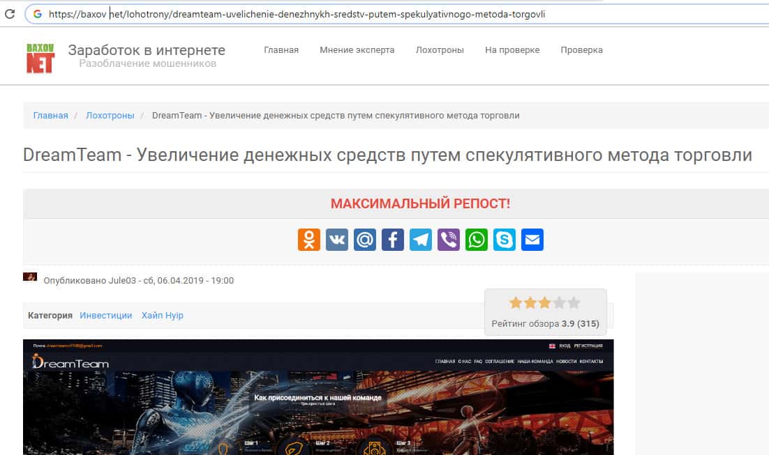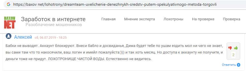 Предупреждение Алексея о лохотроне Дрим Тим на портале baxov net