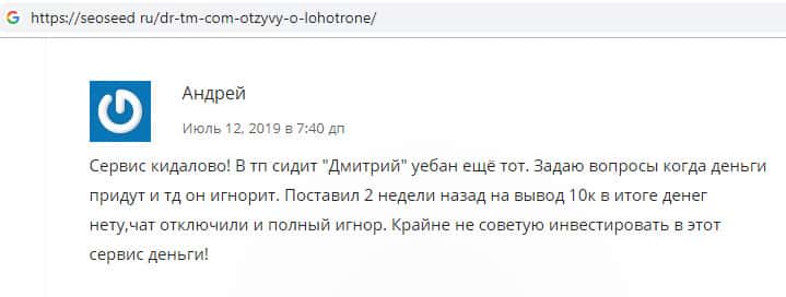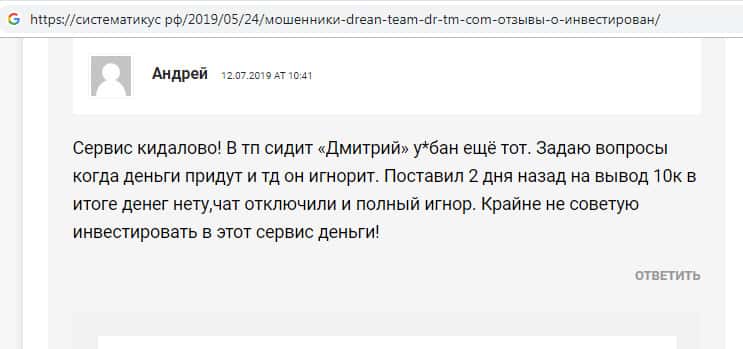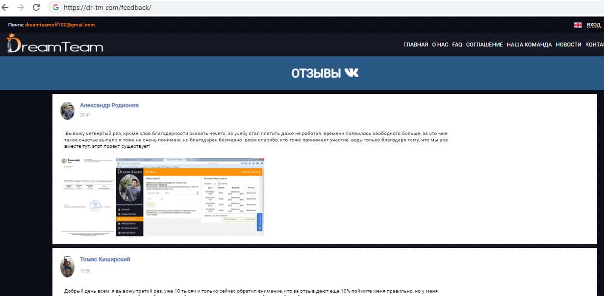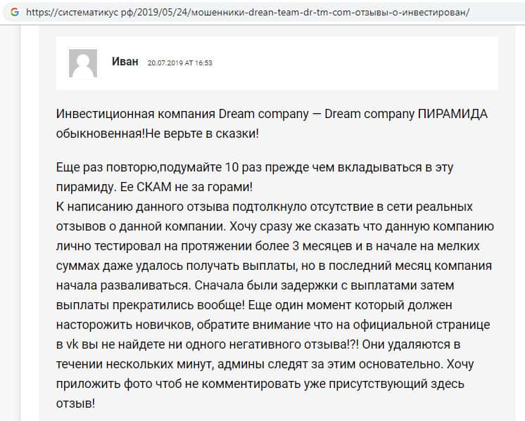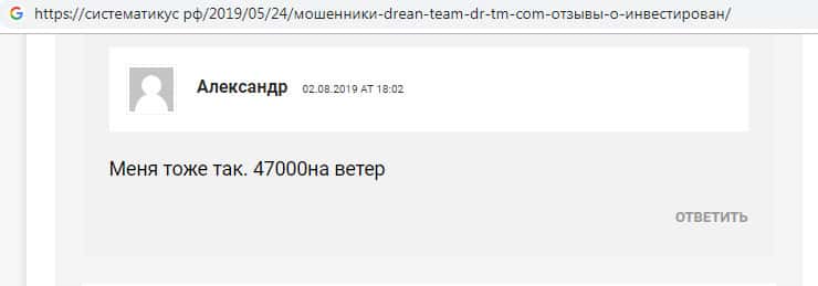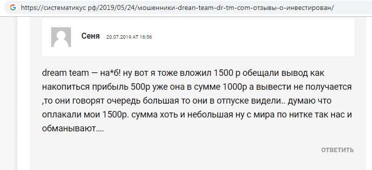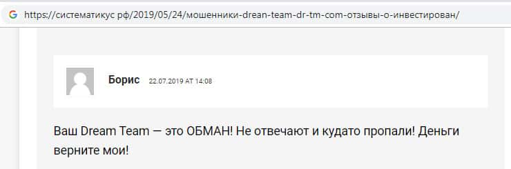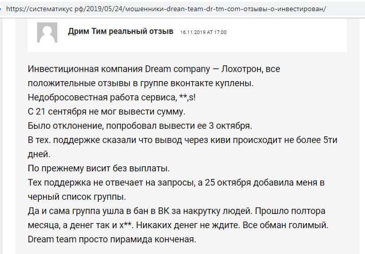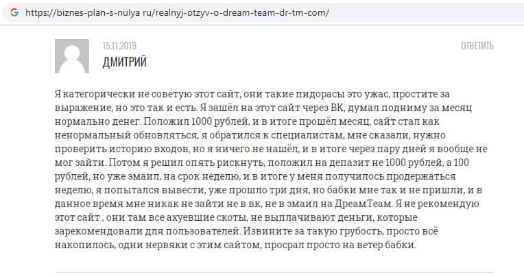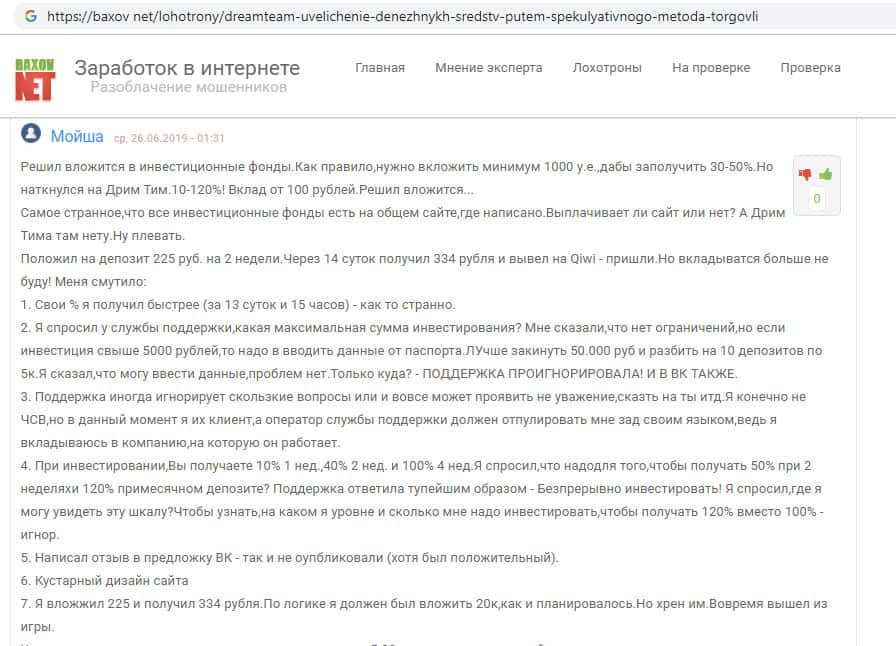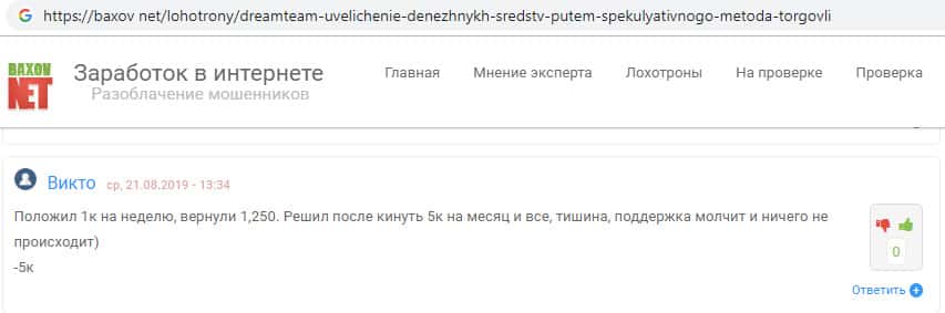 Некий Викто оставил свой отзыв о своем опыте инвестирования с Дрим Тим на портале baxov net. Он рассказал, как его сначала приманили выплатив 1250 рублей после первоо инвестирования тысячи, и затем, когда он положил пять тысяч контакты с компанией оборвались и пять тысяч рублей канули в Лету.