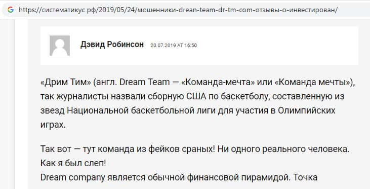 Пользователь Дэвид Робинсон сокрушается о том, как он был слеп и доверился мошенникам из Дрим Тим. Команда мечты превратилась в его глазах в команду фейков, а надежная и уверенная инвестиционная компания в обычную финансовую пирамиду.