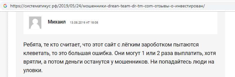 Пользователь по именем Михаил, в своем отзыве сообщает, что как правило Дрим Тим может выполнить одну-две выплаты, затем наступает коллапс: выплаты прекращаются, компания перестает отвечать на запросы.