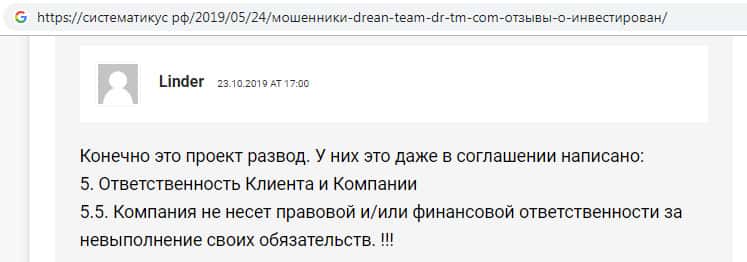 Пользователь с ником Linder оказался одним из немногих, кто читает клиентское соглашение. Он досмотрел, что компания Дрим Тим уже при заключении соглашения снимает с себя всю ответственность и подводит клиента к мысли, что деньи ему никто не вернет и отвечать за это не будет. (пункт 5.5. Клиентское соглашение Дрим Тим).