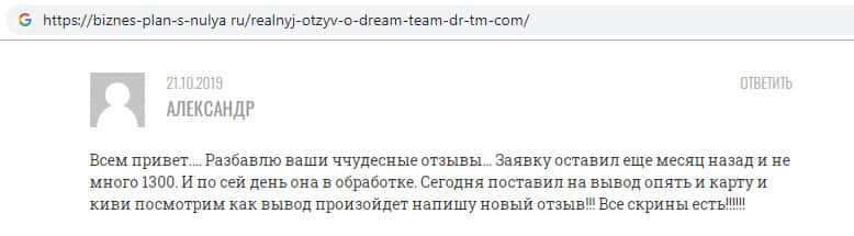 Пользователь, подписавшийся именем Дрим Тим реальный отзыв, рассказывает свою историю отношений с Дрим Тим. Его заявку на вывод денег сначала отклонили, затем при повторной заявке объяснили, что на киви нужно ждать пять дней, но прошло уже полтора месяца, а пользователь всё ещё в ожидании...