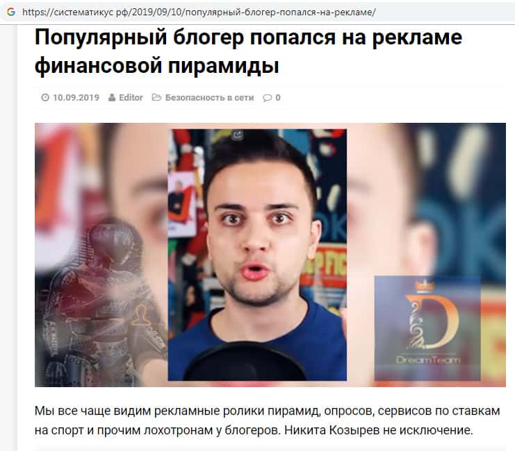Этот же портал АНО Систематика немного позже публикует статью о популярном блогере - авторе Ютуб канала «Козырный уголок» с 1,5 млн подписчиками Никите Козыреве. Никита зачем-то решил попиарить финансовую пирамиду Дрим Тим. Он снимает забавное видео с названием «ПРЕРОЛЛ Дрим тим» в котором расхваливает проект. Зачем ему это? Проплата?