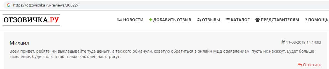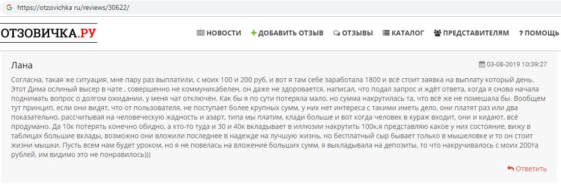 В своем отзыве на портале отзовичка ру пользователь Лана делает вывод о схеме работы команды Дрим Тим. Она описывает, как мошенники завлекают клиентов повышать свои депозиты, делая минимальные выплаты, и как затем прекращают отвечать на вопросы и игнорировать законные требования вкладчиков проекта.