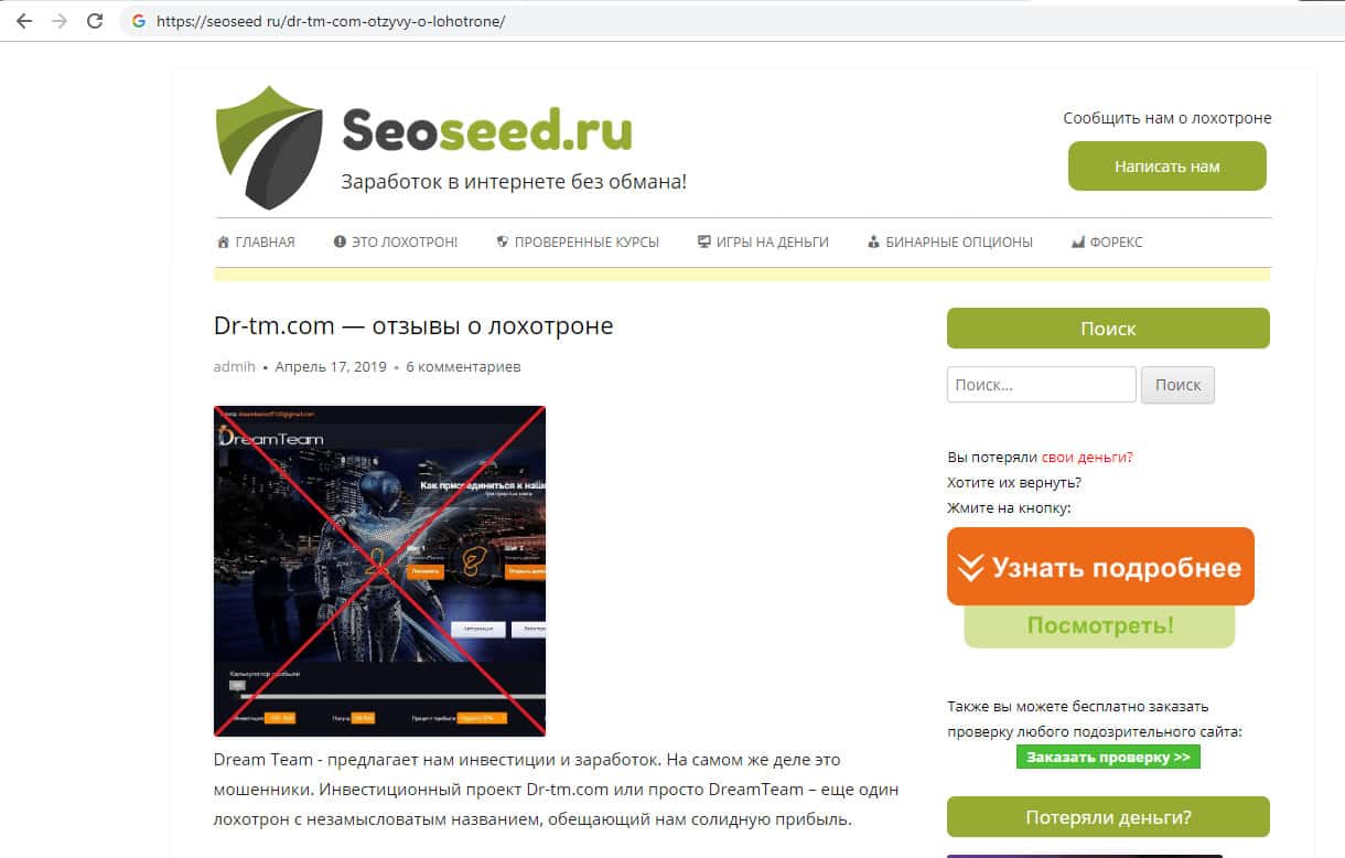 Портал seoseed ru опубликовал статью о мошенниках из Дрим Тим. Это хайп, который функционирует по принципу финансовой пирамиды. Молодой проект, который изначально является скамом. Создан он мошенниками, и им абсолютно наплевать на то, будете ли вы получать прибыль или нет. Они заняты своим делом – собирают денежку с доверчивых вкладчиков.