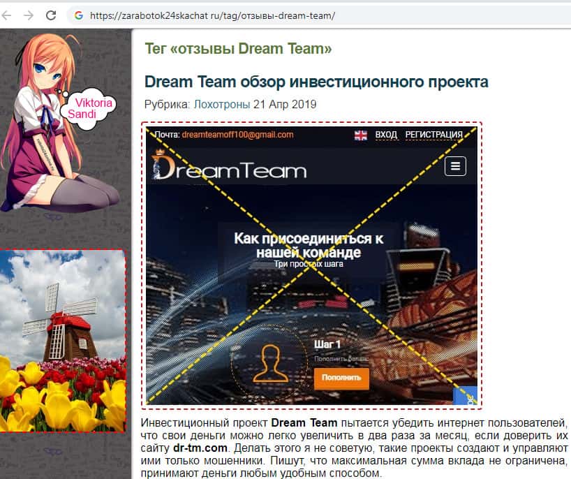 В своем блоге на портале zarabotok24skachat ru Виктория Санди приводит краткий обзор компании Дрим Тим и её инвестиционного проекта. Вывод Виктории однозначен: это мошенники и их финансовая пирамида. Первые вкладчики могут получить незначительные выплаты, по крупным вкладам выплат не будет, и набрав N-ю сумму проект закроется.