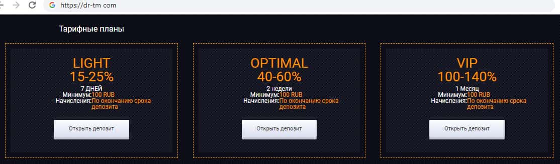 Посчитав будущую прибыль, посетитель готов приступить к сотрудничеству, ему предлагаются на выбор три тарифных плана: Легкий, Оптимальный и V.I.P. Все три тарифных плана позволяют вносить инвестиции начиная со ста российских рублей. Отличаются планы процентами прибыли и длительностью депозита.