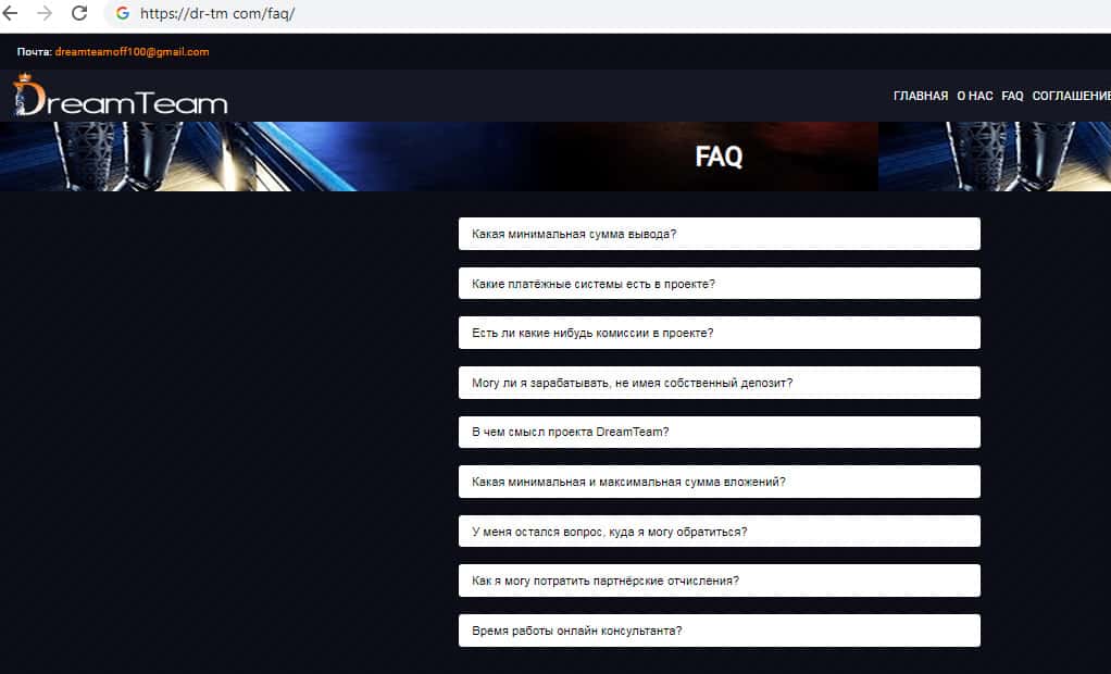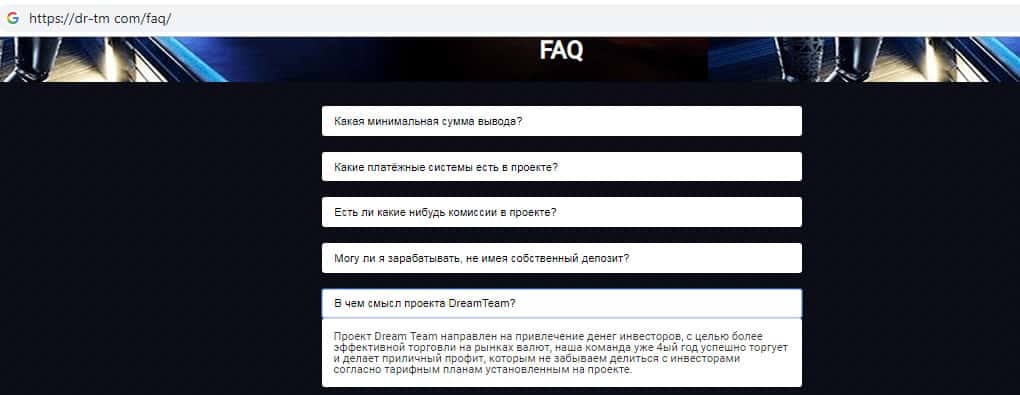 Для тех пользователей, которым оказалось вдруг недостаточно информации в трех предложениях о содержании бизнеса Дрим Тим на странице "О нас", портал компании содержит раздел часто задаваемых вопросов. Он предоставляет расширение информации о компании и её видении и ведении бизнеса аж до девяти вопросов.
