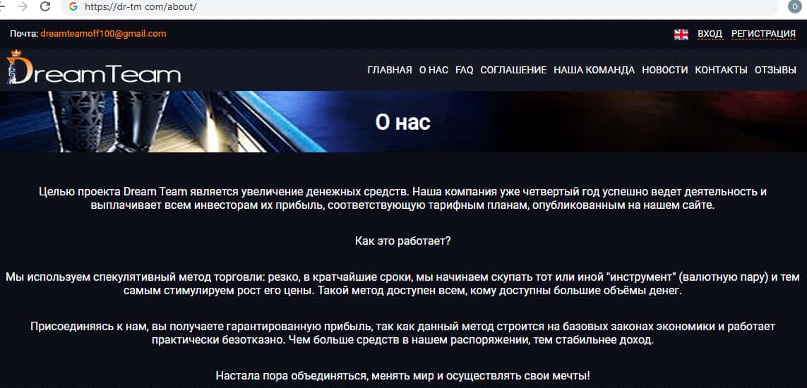 И Вы ещё читаете статью? То ли у ребят с арифметикой слабовато, то ли с головой проблемы. В любом случае это проблемы не аферистов из Дрим Тим, а проблемы тех простачков, которые, не раздумывая, клюют на такой, кое-как слепленный развод. Вон и рейтинг инвесторов, выплаченных прибылей и ударников реферального фронта имеется.