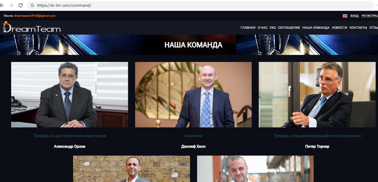 Раздел "Наша команда" портала Дрим Тим предполагает знакомство посетителя сайта с командой специалистов DreamTeam. Страница содержит якобы должности, имена и фотографии пяти сотрудников компании Дрим Тим: трейдеры, аналитик и два директора.
